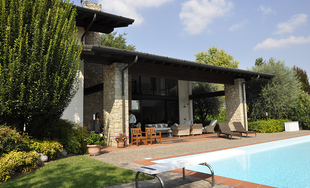 La casa è situata alla periferia di Brescia, dove inizia la pianura. Dalla tipologia tradizionale della cascina bresciana vengono ripresi alcuni elementi architettonici, risolti in linguaggio moderno con ampi spazi interni ed esterni, in un contesto di tranquillità della campagna. Il soggiorno è a doppia altezza, con vista sul vuoto interno, sul portico esterno e sul giardino.